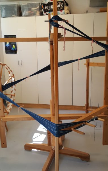 Vi är ca 20 medlemmar och det finns 29 vävstolar. Vi hjälps åt att sätta upp vävarna.