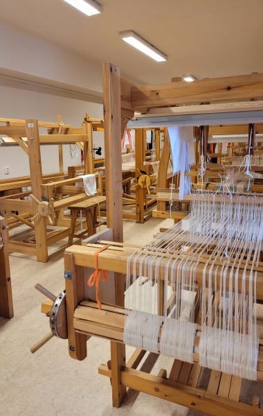 Vävstugan startade 1976. Här finns 13 stora vävstolar och tre bordsvävstolar.